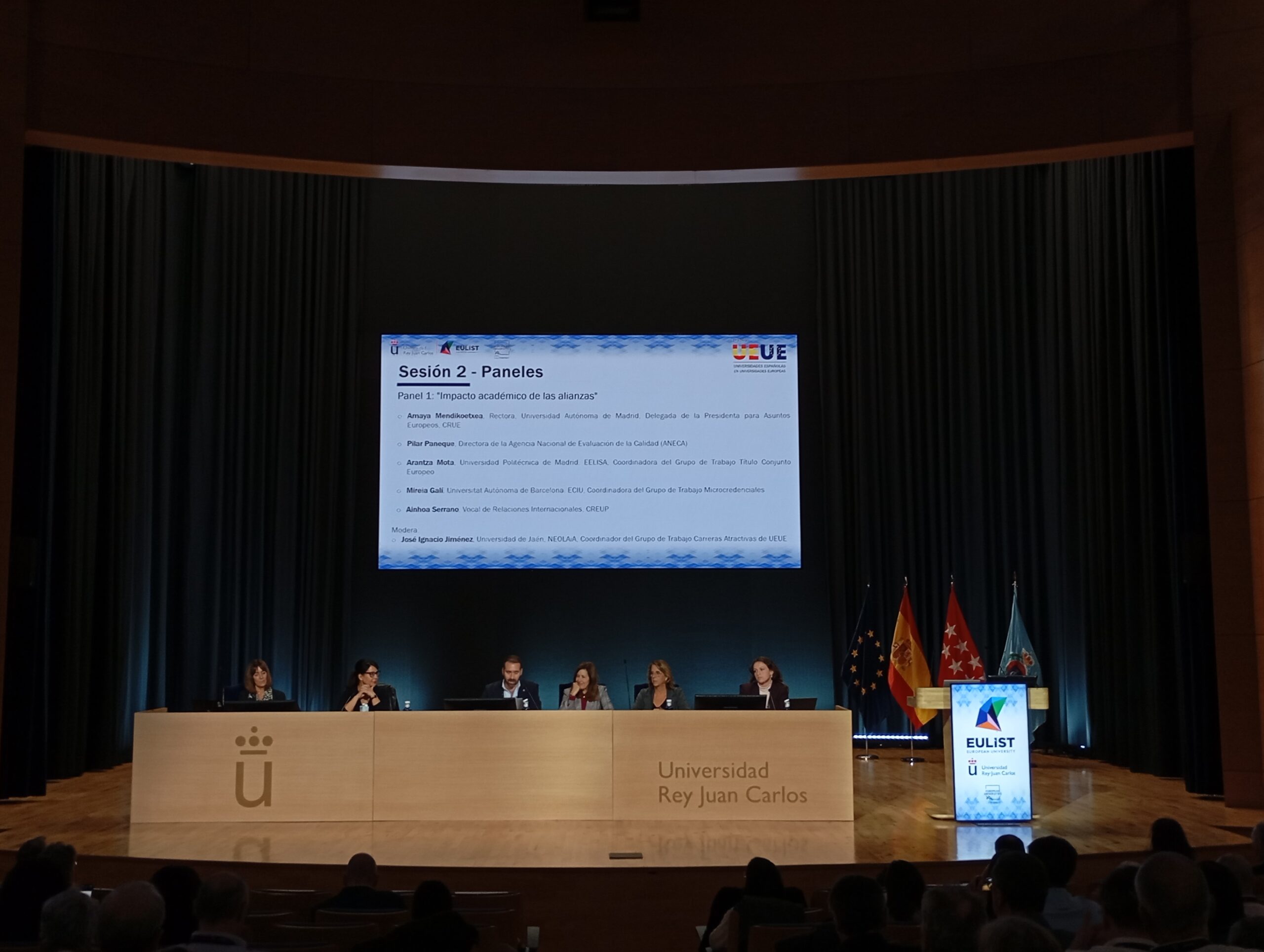 Next, two roundtable discussions were initiated. First, on the topic “Academic impact of the Alliances”, in which participated: Amaya Mendikoetxea, Rector of the Autonomous University of Madrid (UAM) and Delegate for European Affairs of CRUE; Pilar Paneque, Director of the National Agency for Quality Assessment (ANECA); Arantza Mota, Polytechnic University of Madrid (UPM) and EELISA Alliance, and Coordinator of the European Joint Degree Working Group; Mireia Galí, Autonomous University of Barcelona (UAB) and ECIU Alliance, and Coordinator of the Microcredentials Working Group; and Ainhoa Serrano, Member of the Board of International Relations at the Spanish National Association of Student Representatives from Public Universities (CREUP). This round table was moderated by José Ignacio Jiménez, University of Jaén (UJA) and NEOLAiA Alliance, and Coordinator of the Attractive Careers Working Group.