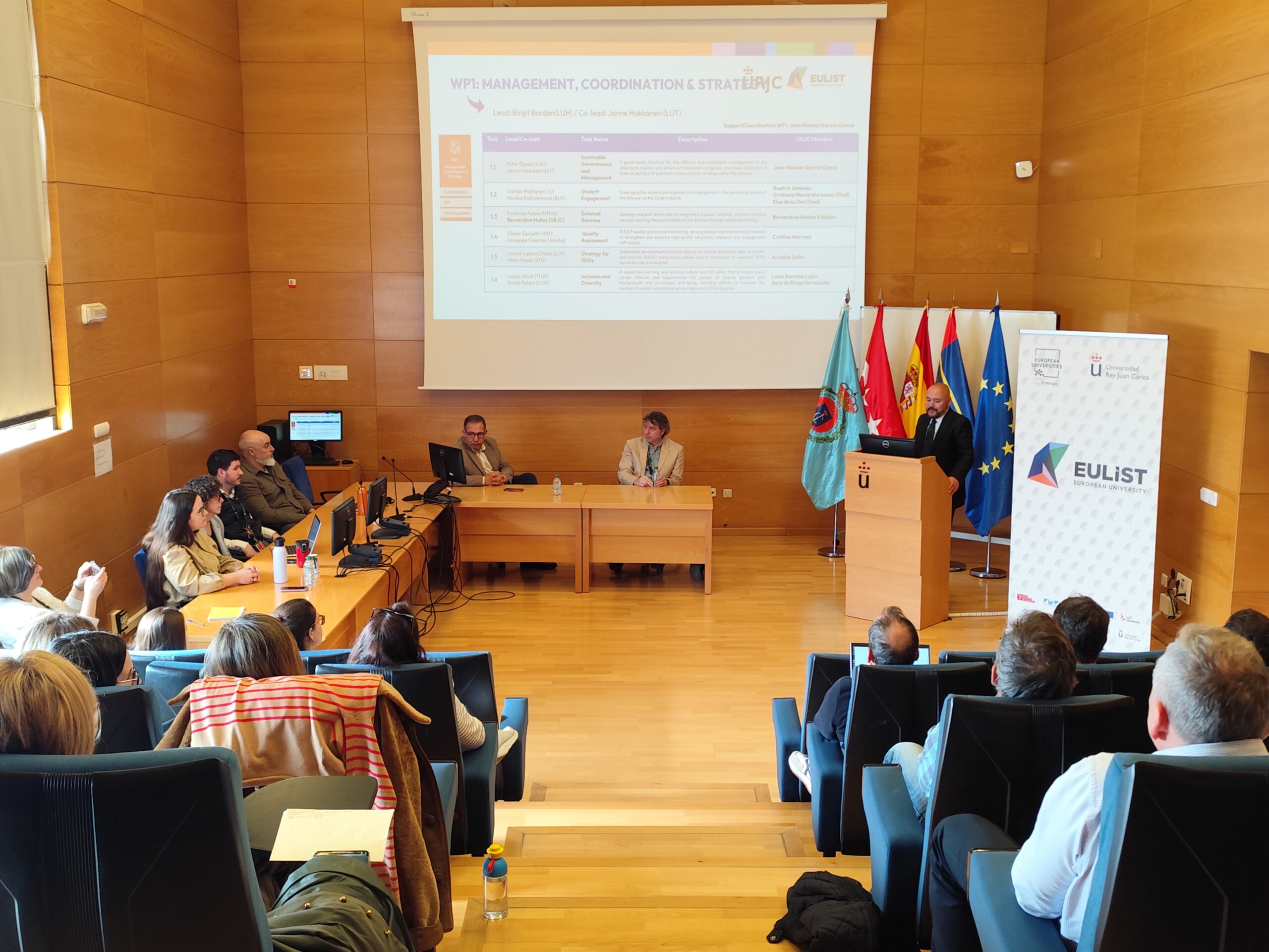 WP2 – Campus, coordinated at URJC by Bernardino Muñoz Valadés, presented key initiatives such as the development of the Digital Campus, the EULiST Course Catalogue, the Knowledge Hub and the Academic Support Centre for students and staff.